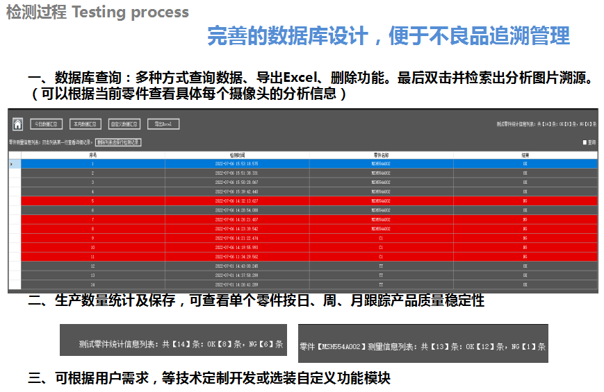 3、檢測零件統(tǒng)計(jì)數(shù)據(jù)可查詢、導(dǎo)出Excel;